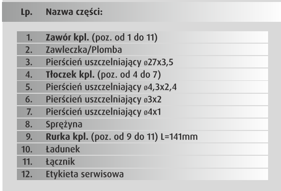 Zawór kompletny do GP1z BC/MP, korpus wykonany jest z tworzywa. Zawór posiada wszystkie części od numeru 1 do 11.