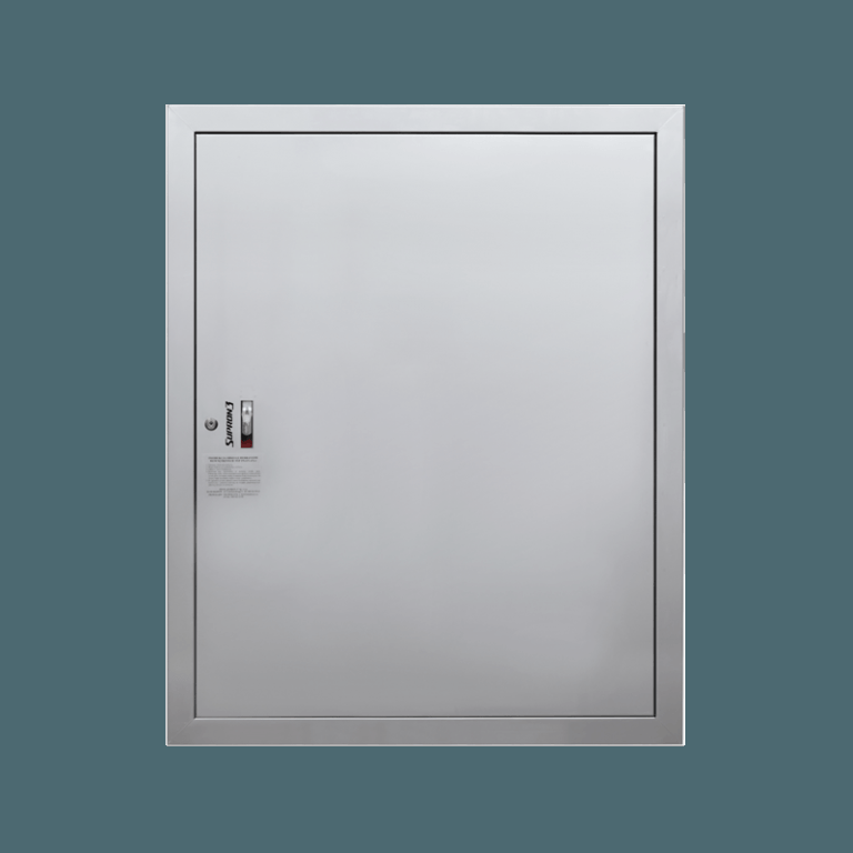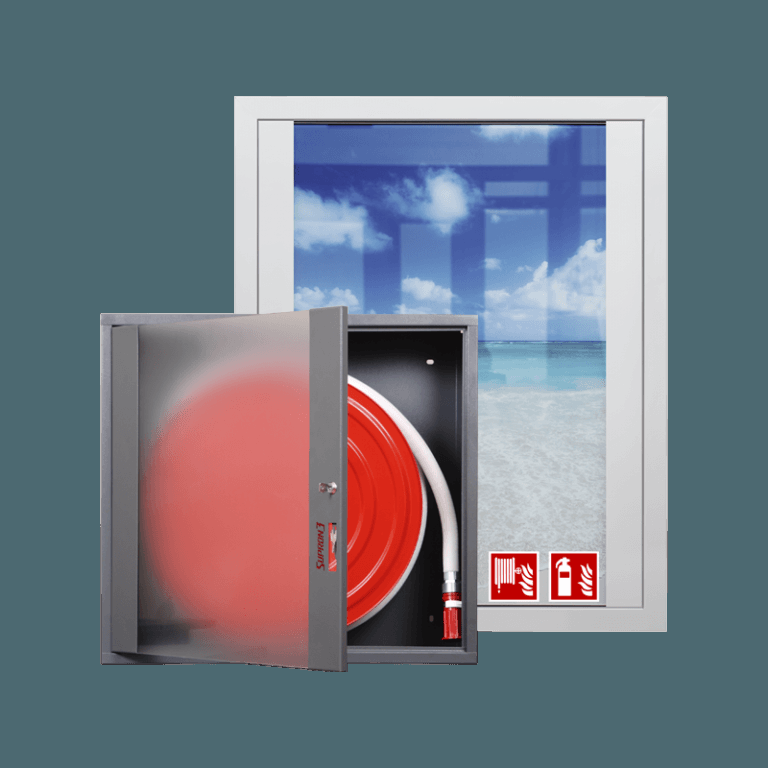 - szafka hydrantowa STANDARD wykonana z blachy czarnej malowanej farbą proszkową poliestrową fasadową typ Facade w kolorze czerwonym (RAL 3000) lub białym (RAL 9003), drzwi pełne; dzięki zastosowaniu zawiasu krytego drzwi szafki można otworzyć o 180º