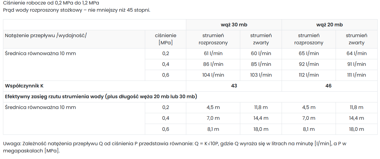 Zastosowane prądownice w wężu ppoż posiadają odpowiednią średnicę dyszy pozwalającą uzyskać minimalną wydajność wody 2,5 dm3/s (150 l/min), oraz płynną regulację pozwalającą uzyskać prąd zwarty lub rozproszony strumienia wody.