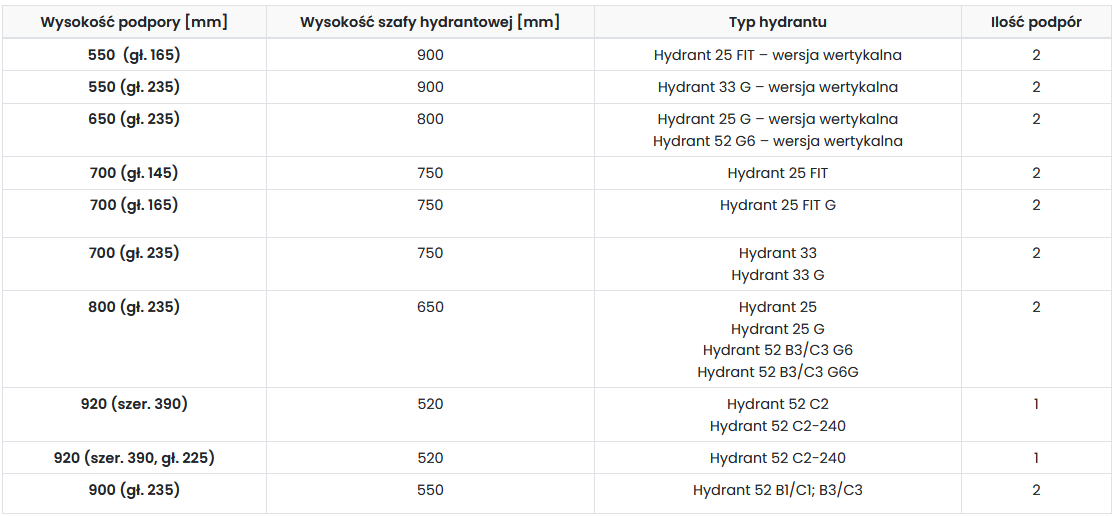 - Wysokość podpory dobrana jest do danego typu hydrantu 25, 33 lub 52 tak aby zawór znajdował się na wysokości 1350 +/- 100 mm od poziomu podłogi
