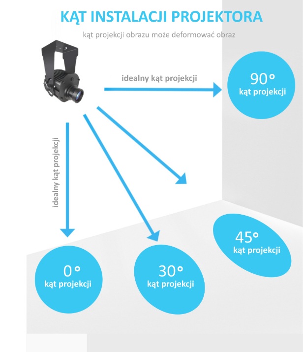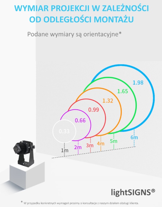 Wielkość wyświetlanego znaku jest zależna od odległości z jakiej rzucany jest obraz na posadzkę. Zjawisko ilustruje poniżej przedstawiony rysunek. W przypadku montażu na większych wysokościach możliwe jest zamówienie slajdów o wymiarach projekcji dostosowanych do indywidualnych wymagań.