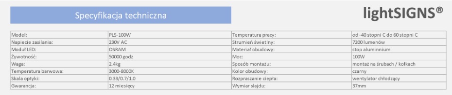 Projektor LED PLS-100 (lightSINGS) to, podobnie jak PLS-50, specjalistyczny projektor do wyświetlania wirtualnych znaków bezpieczeństwa i informacyjnych, ale z większą mocą 100W. Jest to więc mocniejsza wersja urządzenia PLS-50, przeznaczona do zastosowań, gdzie wymagana jest większa jasność i zasięg projekcji.