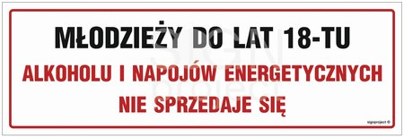 Znak Młodzieży do lat 18-tu alkoholu i napojów energetycznych nie sprzedaje się (NC143) to czytelne i jednoznaczne oznakowanie informujące o zakazie sprzedaży alkoholu oraz napojów energetycznych osobom poniżej 18 roku życia. Tabliczka stanowi ważny element wyposażenia punktów handlowych, w których prowadzona jest sprzedaż detaliczna napojów alkoholowych i energetycznych.