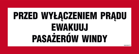 Znak „Przed wyłączeniem prądu ewakuuj pasażerów windy” na płycie PCV (BC129)