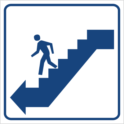 - czytelna grafika wskazująca kierunek zejścia po schodach w dół na lewo