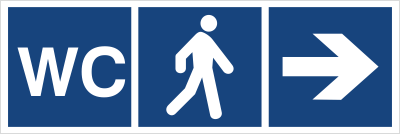 - Wyraźny piktogram WC ze strzałką w prawo – intuicyjne i szybkie w odbiorze oznakowanie