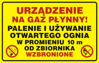 Znak Urządzenie na gaz płynny- palenie i używanie otwartego ognia w r=10m od zbiornika wzbronione (JD019)