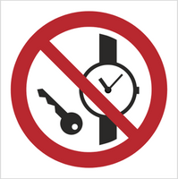 Znak zakaz wstępu z przedmiotami metalowymi i zegarkami na płycie PCV (P08) (ISO 7010)